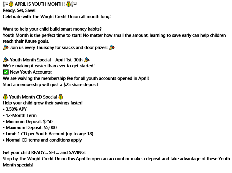 You are leaving The Wright CU's website. Links that may be accessed via this site are for the convenience of informational purposes only. Any products or services accessed through this link are not provided or guaranteed by The Wright Credit Union. The site you are about to visit may have a privacy policy that is different than The Wright Credit Union’s. Please review their privacy policy. The Wright Credit Union does not endorse the content contained in these sites, nor the organizations publishing these sites, and hereby disclaims any responsibility for such content.